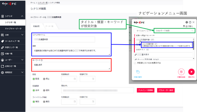 「概要」は、シナリオの内容を端的にまとめた文章を登録することができる機能です。ナビゲーションメニューのシナリオ選択時に、マウスオーバーするとツールチップ形式で表示されます。「キーワード」は、シナリオの検索性を高めるための機能です。シナリオのタイトル・概要・キーワードは、翻訳に対応し、ナビゲーションのメニュー画面における検索対象となります。