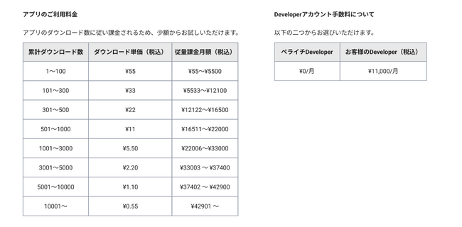 アプリのダウンロードにより下表の料金が発生します。累進加算方式が適用され、ダウンロード数ごとの料金は下記のとおりです。また、Apple App StoreおよびGoogle Play Storeの管理代行費用(※)は無料です。