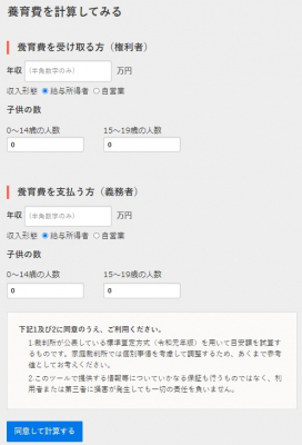 このツールは、離婚弁護士相談Cafe( (リンク ») )上で無料で提供されています。利用者は、「受け取る側」および「支払う側」の年収、収入形態、養育している子供の人数を入力することで、養育費の相場を即座に試算することができます。