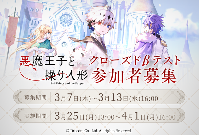 『悪魔王子と操り人形』の悲しくも儚いダークファンタジーならではの世界観の奥深さや、リッチで繊細なグラフィック、個性的なキャラクターたちの魅力を味わっていただければと思います。テスト参加者のみなさまからのご意見・ご感想を参考に、さらなる品質向上に努めてまいります。