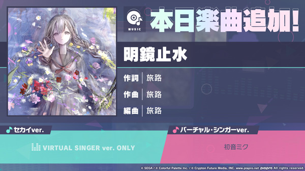 株式会社セガ(本社:東京都品川区、代表取締役社長COO:杉野行雄)と株式会社Colorful Palette(本社:東京都渋谷区、代表取締役社長:近藤裕一郎)は、iOS/Android向けリズム&アドベンチャー『プロジェクトセカイ カラフルステージ! feat. 初音ミク(以下、プロジェクトセカイ)』について、2024年3月8日(金)より、新たに「明鏡止水」(作詞・作曲:旅路)をリズムゲーム楽曲に追加いたしました。