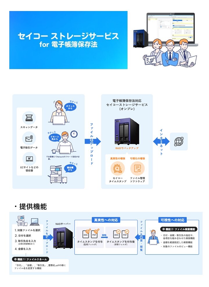 「セイコー ストレージサービス」は、大容量データの保管が可能なNASサーバー(NAS:Network Attached Storage)と総務大臣認定のセイコータイムスタンプサービス(5年分)・ファイル管理ソフトウェアがセットになっており、「クラウド利用が難しい」「手元にデータを残したい」「データは自分で管理するので、手軽に安価に実現したい」といった要望を持つ中小規模の事業者向けのサービスです。NASサーバーにデータをアップロードすると、自動でタイムスタンプを押印し、長期に亘りデータを保存しておく事が可能です。データ容量は2TB(300万を超えるPDFファイル)の保存領域を有しており、契約期間の5年経過後に、再契約にて新しいNASサーバーに交換することにより、法人の書類保存期間7年間に対応します。簡単な機器設置のみで、電子帳簿保存法が求めるデータ保存の要件を満たし、大容量データ保管とデータへのリモートアクセスを可能にします。