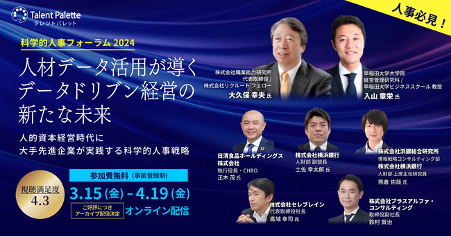 株式会社プラスアルファ・コンサルティング(本社:東京都港区、代表取締役社長:三室克哉 証券コード:4071)が2024年2月27日(火)に大手町サンケイホールにて「科学的人事フォーラム2024 『人材データ活用が導くデータドリブン経営の新たな未来』」(主催:東洋経済新報社、共催:プラスアルファ・コンサルティング)を開催し、3月15日(金)よりオンラインにてアーカイブ配信を実施いたします。
