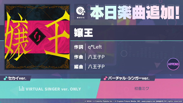 著作権表記:(C) SEGA / (C) Colorful Palette Inc. / (C) Crypton Future Media, INC. www.piapro.net All rights reserved.
