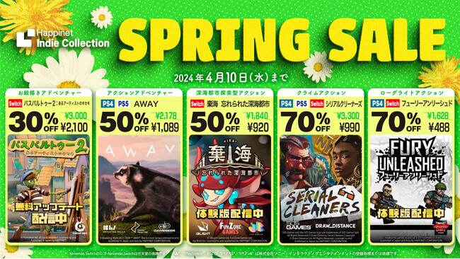 株式会社ハピネット(本社:東京都台東区、代表取締役社長:榎本誠一、証券コード:7552)は、おもしろいインディーゲームを世界中からセレクトして発売するゲームレーベルHappinet Indie Collectionタイトルのダウンロード版について、最大70%OFFとなるセールを実施します。2024年4月10日(水)まで、全5タイトルが特別価格でお求めいただけます。