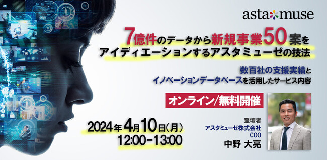 【タイトル】7億件のデータから新規事業50案をアイディエーションするアスタミューゼの技法 ~数百社の支援実績とイノベーションデータベースを活用したサービス内容~