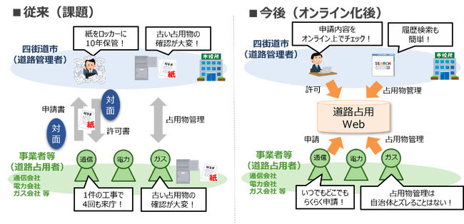 本実証において「道路占用Web」を活用したことで、行政機関の申請窓口業務における非対面化を図り、従来の申請受付における時間的な制約や申請書類の記載不備などにより事業者が複数回にわたって来庁する必要性が解消したほか、ペーパレス化及び申請許可情報の一元管理と進捗の見える化などにつながり、その効果を確認することができたことから、今回、四街道市において本格的に運用することとなりました。