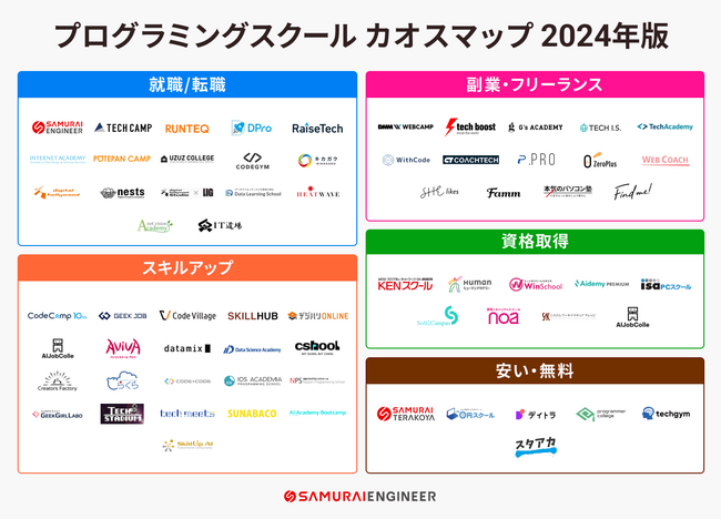 「質の高いIT教育を、すべての人に」をミッションに、4万5,000名以上の受講生を指導してきたプログラミングスクール「侍エンジニア」を運営する株式会社SAMURAIは、『2024年版プログラミングスクールのカオスマップ』を公開しました。