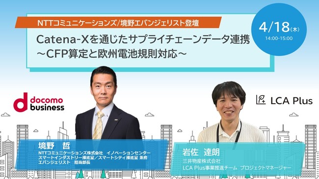 三井物産株式会社(本社:東京都千代田区、社長:堀健一、以下「三井物産」)が提供する脱炭素プラットフォーム「LCA Plus」は、2024年4月18日(木)に無料オンラインセミナー「NTTコム/エバンジェリスト登壇!Catena-Xを通じたサプライチェーンデータ連携~CFP算定と欧州電池規則対応~」を開催します。