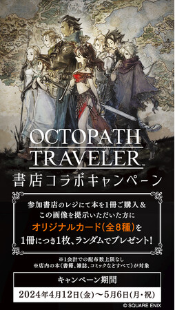 日本出版販売株式会社(代表取締役社長:奥村 景二、略称:日販)は、株式会社スクウェア・エニックス(代表取締役社長:桐生 隆司)が手掛けるロールプレイングゲーム(以下RPG)「オクトパストラベラー」とコラボレーションし、2024年4月12日(金)~5月6日(月・祝)の期間中、全国413書店にて、商品ご購入時にオリジナルカード(全8種)がもらえるノベルティキャンペーンを実施します。