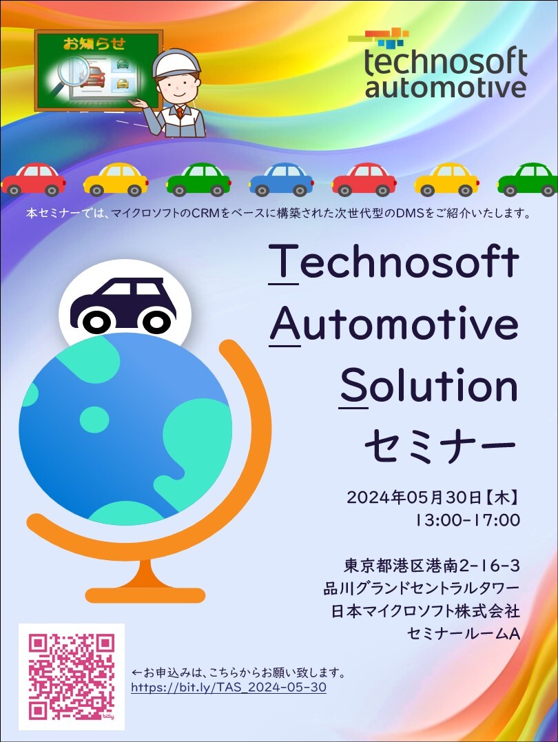 ディーラーソリューションを提供するTechnosoft Automotive(本社:シンガポール、CEO:Fredy Tan)の日本法人Technosoft Japan 株式会社は、5月30日(木)午後、OEM/ディーラー向けにTechnosoft Automotive Solution(以降、TAS)をご紹介するセミナーを開催いたします。
