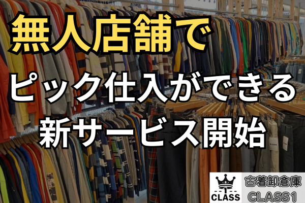 古着卸倉庫CLASS1がご提供する新サービス「CLASS1店頭ピック」では、無人の古着店の店頭で気軽にピック仕入ができます。
