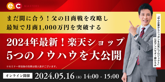 日本全国のECショップ約2,500社が所属する「ECマスターズクラブ」を運営する日本ECサービス株式会社(本社:東京都渋谷区、代表取締役:清水 将平)は、2024年最新!楽天ショップ5つのノウハウを大公開をテーマに日本ECサービス株式会社公認セミナー講師の小野 稜太によるセミナーを2024年5月16日(木)にオンラインで開催します。