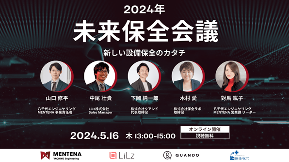 八千代エンジニヤリング株式会社(本店:東京都台東区、代表取締役社長執行役員:高橋 努)は、株式会社保全ラボ(所在地:東京都品川区、代表取締役:清岡 大輔)、LiLz株式会社(所在地:沖縄県宜野湾市、代表取締役社長:大西 敬吾)、株式会社クアンド(所在地:福岡県北九州市、代表取締役CEO:下岡 純一郎)をゲストとしてお招きし、『未来保全会議 新しい設備保全のカタチ』と題したオンラインカンファレンスを2024年5月16日(木)に開催します。