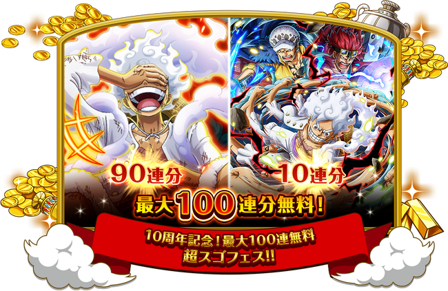 ギア5ルフィも登場する超スゴフェスが90連分、 新キャラクター達も登場する10周年超スゴフェスが10連分、最大100連分の超スゴフェスが無料です! 新キャラクター達を手にいれるチャンス!この機会をお見逃しなく!!