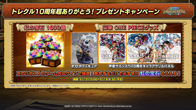 App Store/Google Play向けスマートフォンアプリ『ONE PIECE トレジャークルーズ』は、皆様のおかげで5/12(日)に10周年を迎えました。
