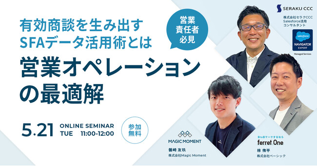 本ウェビナーでは、BtoBマーケティング支援サービス「ferret One」を提供するベーシック社・Salesforce の定着 / 活用を支援するセラクCCC社・AIセールスエンゲージメントプラットフォーム「Magic Moment Playbook」を提供する Magic Moment、以上3社が、有効商談を生み出すための営業オペレーション改革・SFAデータ活用術についてご紹介します。