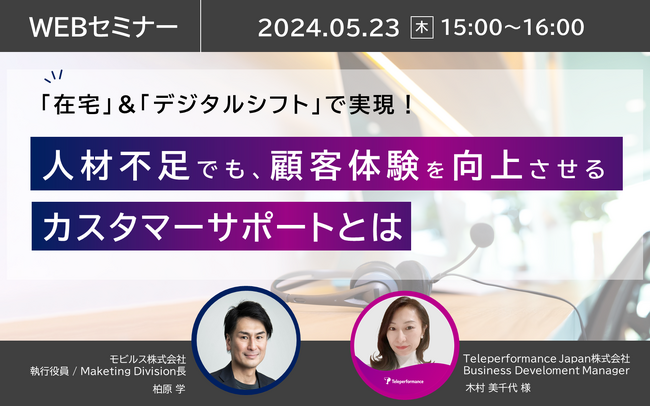 The SupportTech Companyとして顧客サポート支援のソリューションを開発・提供するモビルス株式会社(本社:東京都港区、代表取締役社長:石井智宏)は、5月23日(木)に『人材不足でも、顧客体験を向上させるカスタマーサポートとは』というテーマでオンラインセミナーを開催します。