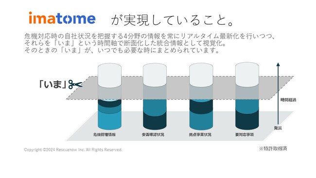 危機管理サービスを提供する株式会社レスキューナウ(本社:東京都品川区、代表取締役:朝倉一昌)は、昨年7月に提供を開始した災害・BCP対応のオートメーション化に対応したオールインワン危機管理サービス「imatome(イマトメ)」の特長でもある「自動サマライズ技術」について、2024年5月10日付で特許(特許第7486853号)を取得しました。