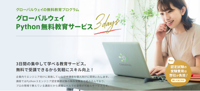 「“人”と“技術”を新しい時代のために」という経営理念のもと、急激に変化する時代のデジタルトランスフォーメーション(DX)に貢献できる企業として、様々なサービスを提供している株式会社グローバルウェイ(本社:東京都渋谷区、代表取締役:小山義一、証券コード:3936、以下「当社」)は、「グローバルウェイ Python無料教育サービス(3days)」を開始いたします。