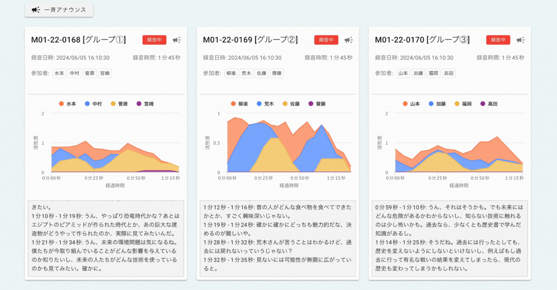 各グループの発話の様子をテキストやグラフでリアルタイムで見える化します。