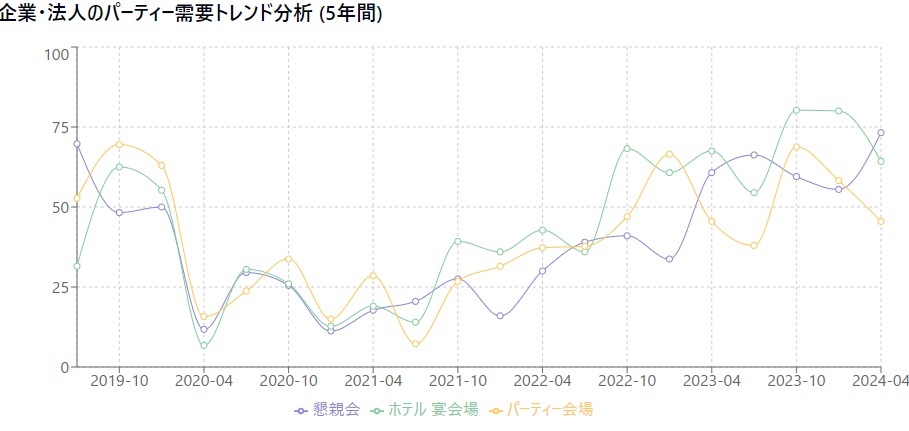 株式会社アイデアログが運営する「会場ベストサーチ」は、2019年7月から2024年6月までの5年間における企業・法人のパーティー需要をGoogleトレンドで分析しました。「懇親会」「ホテル 宴会場」「パーティー会場」の3つの検索クエリを対象とした調査結果から、パンデミック後の力強い需要回復が明らかになりました。特に2022年後半以降、需要が顕著に上昇し、2024年前半にはパンデミック前の水準を上回っています。