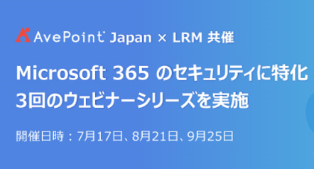 法人向けクラウドデータ管理ツールを開発するAvePoint Japan株式会社(本社:東京都品川区、代表取締役:塩光 献、以下「AvePoint」「当社」)は、情報セキュリティの総合コンサルティング会社であるLRM株式会社(本社:兵庫県神戸市、代表取締役CEO:幸松 哲也、以下「LRM」)と共催で「Microsoft 365セキュリティ」をテーマとしたセミナーを3回シリーズで開催いたします。