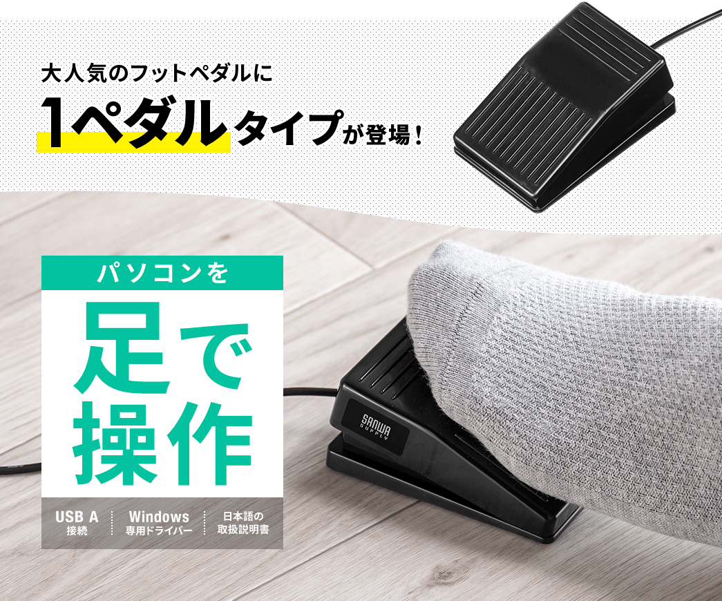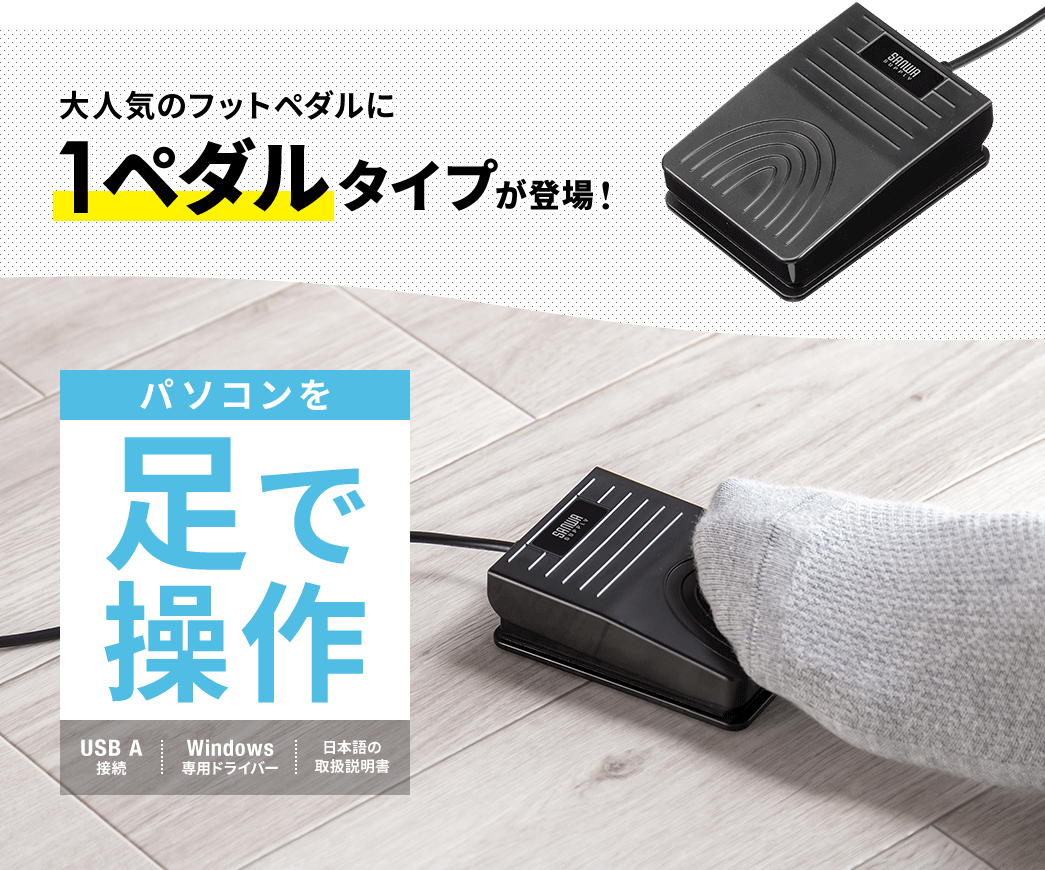 サンワサプライ株式会社(本社:岡山市北区田町1-10-1、 代表取締役社長 山田 和範)が運営している直販サイト『サンワダイレクト』では、足でパソコンの操作ができて、好きな操作を割り当てできる1ペダルタイプのUSBフットペダル 「400-MA212BK(奥押しタイプ)」「400-MA213BK(手前押しタイプ)」を発売しました。