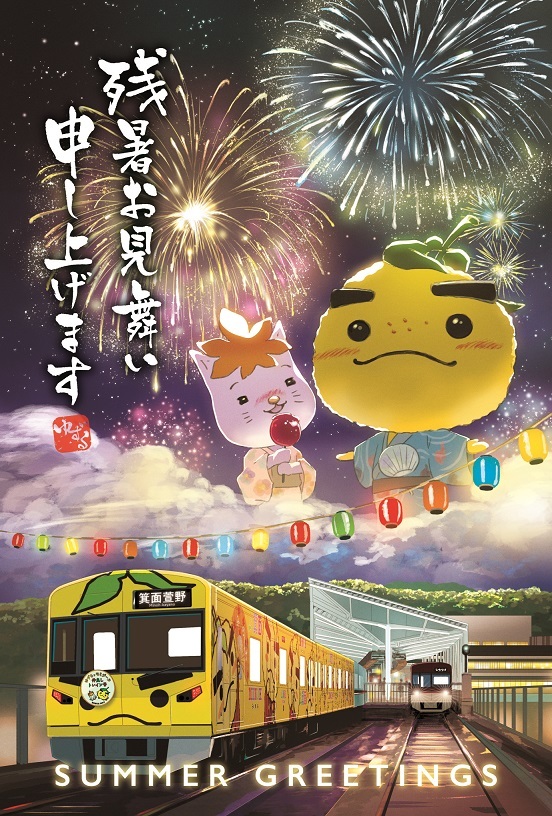 第6弾となる今回は、「北大阪急行延伸線開業と夏の花火」をテーマとして、市のキャラクター「滝ノ道ゆずる」と「モミジーヌ」が花火を見上げる下に新しく開業した北大阪急行(「ゆずるとモミジーヌ仲良しトレイン号」)が走る様子が描かれたイラストを使用します。
