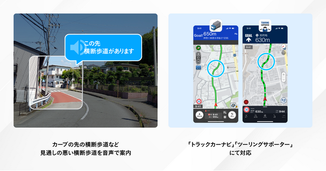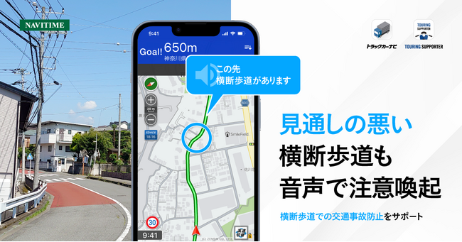 株式会社ナビタイムジャパン(代表取締役社長:大西 啓介、本社:東京都港区)は、2024年8月6日(火)より、トラック専用カーナビアプリ『トラックカーナビ by NAVITIME』とバイク専用ナビゲーションアプリ『ツーリングサポーター by NAVITIME』にて、見通しが悪く、信号機や一時停止のない横断歩道の手前で、音声による注意喚起をする機能を提供開始いたします。