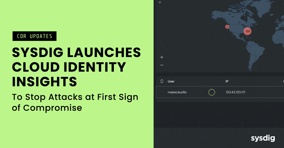8/7/2024 - 米国ネバダ州ラスベガス発 - リアルタイムクラウドセキュリティのリーダーであるSysdigは本日、クラウド検知と対応(CDR)機能の拡張機能として「Cloud Identity Insights(読み方:クラウド・アイデンティティ・インサイツ)」の提供開始を発表しました。「Cloud Identity Insights」は、アイデンティティの振る舞いをワークロードのアクティビティやクラウドリソースと相関させることを目的としています。侵害されたアイデンティティを即座に検知し、リアルタイムで封じ込め、高度なポリシー最適化によってそれ以降の侵害を防止します。この広範に深く詳細に検知し対応できる機能は、Sysdigが提供するエンタープライズ対応エージェント、Sysdig Agentの次世代版によって実現されています。この次世代エージェントは、同社の軽量なインストルメンテーションを基盤としており、リソース使用量を50%削減し、世界的に準拠した第2世代のeBPFプローブとオープンソースのFalcoの両方に対応しています。