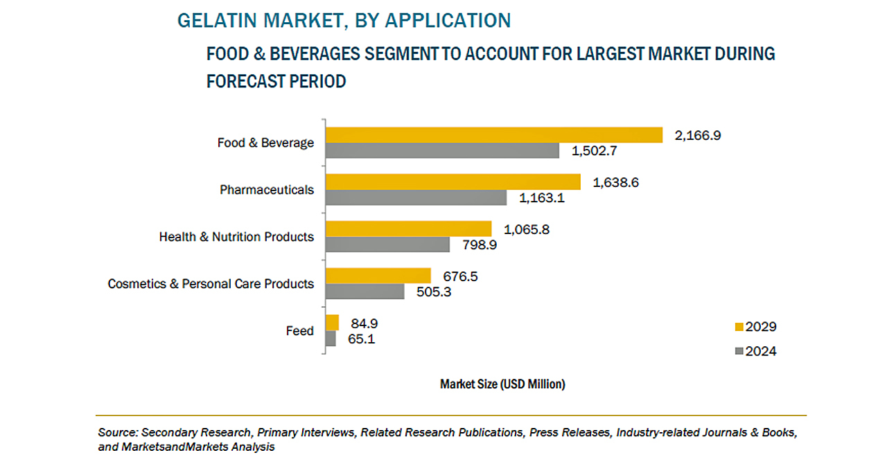 ゼラチンの市場規模は、2024年の40億米ドルからCAGR6.9%で成長し、2029年には56億米ドルに達すると予測されています。用途別に、農業用途に次ぐ急成長が予測されるのは、アンチエイジング、抗酸化、抗シワの特性を持つ化粧品とパーソナルケア製品です。ゼラチンに対する需要は、ローション、化粧品、ウェーブセットローションのようなヘアケア製品など、ほとんどのパーソナルケア製品にあります。また、乾燥や色素沈着の緩和にも役立ちます。ゼラチンに多く含まれるタンパク質は、髪や爪に良いとされています。人間の皮膚に対する優れた生理活性により、ゼラチンはほとんどの化粧品に配合されています。また、化粧品としての安全性も報告されています。メーカー各社は、クリームやパウダーからリップカラーやシャンプーに至るまで、ほとんどすべての美容・化粧品にゼラチンを使用しています。化粧品におけるゼラチンの需要の高さは、時間の経過とともに生活の変化やストレスの多いライフスタイルがもたらす老化症状に起因しています。