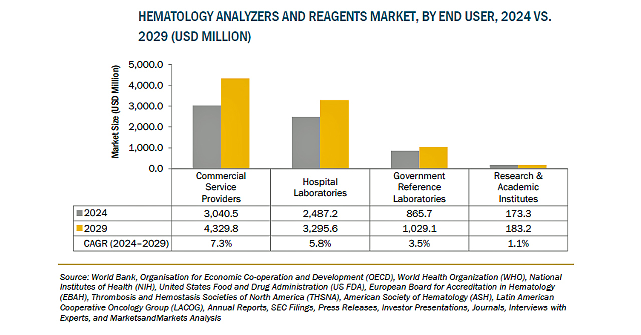 製品・サービス別に、市場は、血液学製品・サービス、止血製品・サービス、免疫血液学製品・サービスに分類されます。2029年までの間、血液学製品・サービス分野が市場を支配すると予想されます。さらに、血液学製品・サービス分野は、機器、試薬、消耗品およびサービスの3つのサブセグメントに分けられます。新興国でのPOC検査用血液分析器の採用が増加し、世界中で技術的に高度な血液学関連製品が発売されたことが、この市場セグメントの成長につながりました。