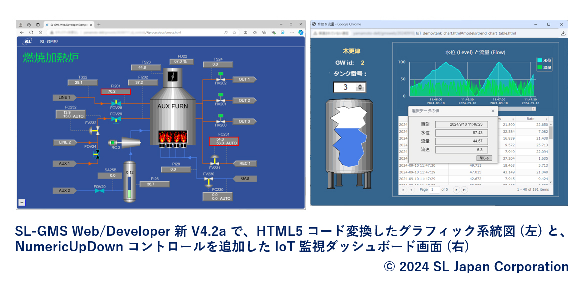 2020年秋に待望の HTML5 版 SL-GMS 新製品としてリリースされた V1.0a に続いて翌年 2021年にリリースした V2.0a と V3.0a では、組み込みグラフとテーブル、詳細画面へのドリルダウン、複数の画面レイヤ、連続ズームと矩形で領域選択ズーム、地図上に動的グラフィックオブジェクトをインスタンスなど多数の新機能を追加し、複数現場から集約した IoT データを一元監視するダッシュボードの開発を支援強化しました。そして、2022年にリリースした V4.0a では、オーバービュー小窓やブリンク機能など、従来の SL-GMS 製品 (C++, Java, .NET) による開発でよく実装される多彩なグラフィック機能を HTML5 版に追加し、制御システムのブラウザ運用を強化しました。さらに 2023年にリリースした V4.1a では、テーブル列に SL-GMS モデルを表示や Web フォントのサポートなど、細部に至って小回りが利く数々の新機能が追加されました。