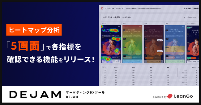 株式会社LeanGo (本社:東京都目黒区、代表取締役:平井 翔吏、以下 弊社) は、自社の運営するマーケティングDXツール「DEJAM( (リンク ») )」が5画面で各指標を確認できるヒートマップ分析をリリースをしたことをお知らせいたします。