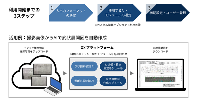 応用地質株式会社(本社:東京都千代田区、代表取締役社長:天野 洋文、以下「当社」)のグループ会社である株式会社OX(東京都渋谷区、代表取締役社長:北村尚紀、以下「OX社」)は、インフラ点検 AI サービス「OX プラットフォーム」の提供を開始しましたのでお知らせします。