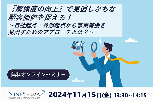 ナインシグマ・ホールディングス株式会社(本社:東京都千代田区、代表取締役社長:諏訪 暁彦、以下「ナインシグマ」)は、企業のR&D部門等に伴走し、各社が持つ「技術」の力を引き出す新規事業・研究開発テーマの創出から実行までのイノベーション活動支援を、世界850社以上・国内280社以上に提供しています。この度、事業機会創出において企業が顧客価値を見逃さないための手法である「解像度の向上」をテーマとした無料オンラインセミナー【『解像度の向上』で見逃しがちな顧客価値を捉える!~自社起点・外部起点から事業機会を見出すためのアプローチとは?~】を開催いたします。本日より参加登録を開始いたします。