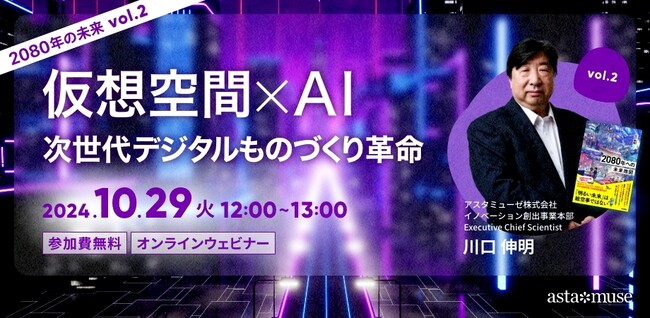 アスタミューゼ株式会社(本社:東京都千代田区、代表取締役社長 永井歩)は、2024年10月29日(火)12:00-13:00に、『2060 未来創造の白地図』および『2080年への未来地図』著者、弊社のExecutive Chief Scientistである川口伸明による無料ウェビナー「仮想空間×AI:次世代デジタルものづくり革命 ~2080年の未来シリーズvol.2~」を再開催いたします。書籍に取り上げた技術領域や社会課題、未来世界について語るウェビナーです。