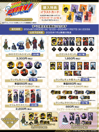 アニメ『家庭教師ヒットマンREBORN!』のリボーン、沢田 綱吉、雲雀 恭弥、六道 骸、ディーノ、XANXUS、S・スクアーロの7名の描き下ろしイラストを使用した特別なグッズを受注販売します。