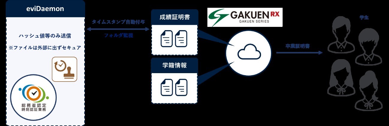 日本システム技術の「GAKUENシリーズ」で作成された成績証明書データに、セイコーソリューションズのeviDaemon for PAdESによる電子証明書とタイムスタンプを組み合わせることで、卒業証明書のデータ真正性を担保し、電子発行を可能にしました。