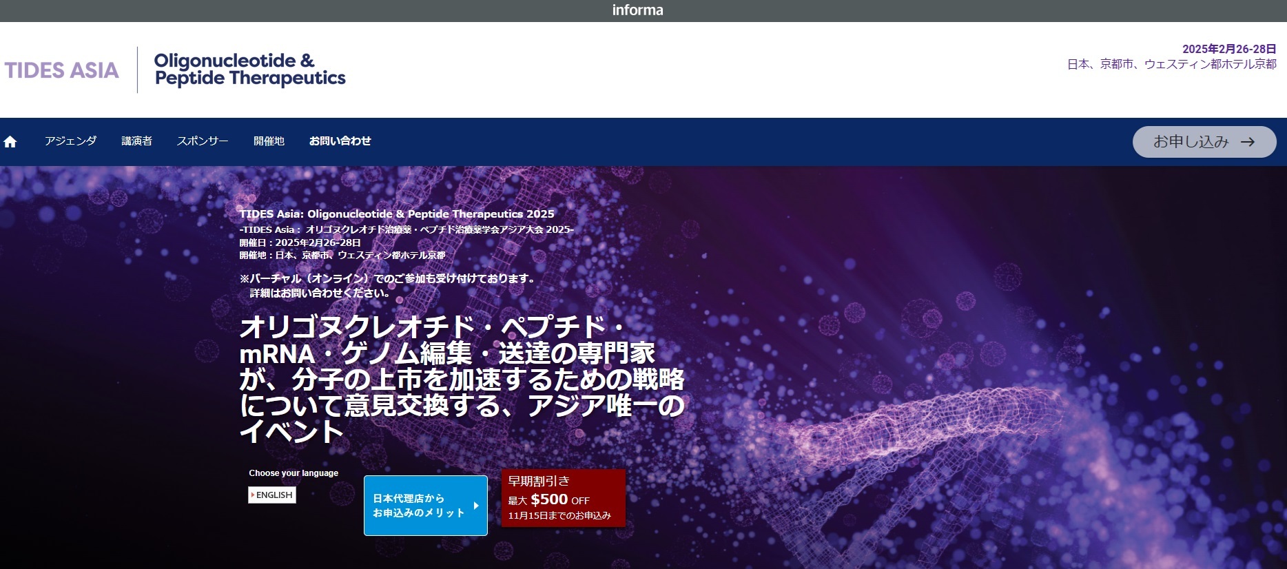 TIDES Asia:Oligonucleotide & Peptide Therapeutics 2025にご参加希望の方は、お早めにお申し込みください。
