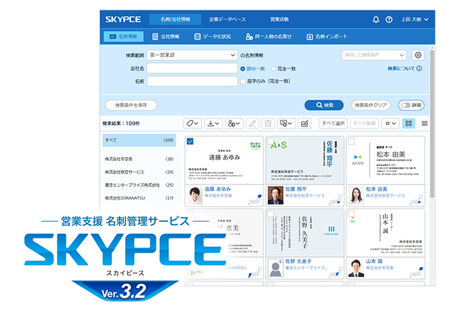 最新バージョン「SKYPCE Ver.3.2」では、お客様の営業活動をご支援するために、URLのクリック率を自動計測して顧客への配信メールの効果測定を支援する機能や、企業ごとの役員情報をチェックできる機能などを搭載。スマートフォン同士で名刺交換ができる仕組みや、名刺登録がよりスムーズに行える連続撮影モードも用意するなど、さらに使いやすいサービスへと進化しました。