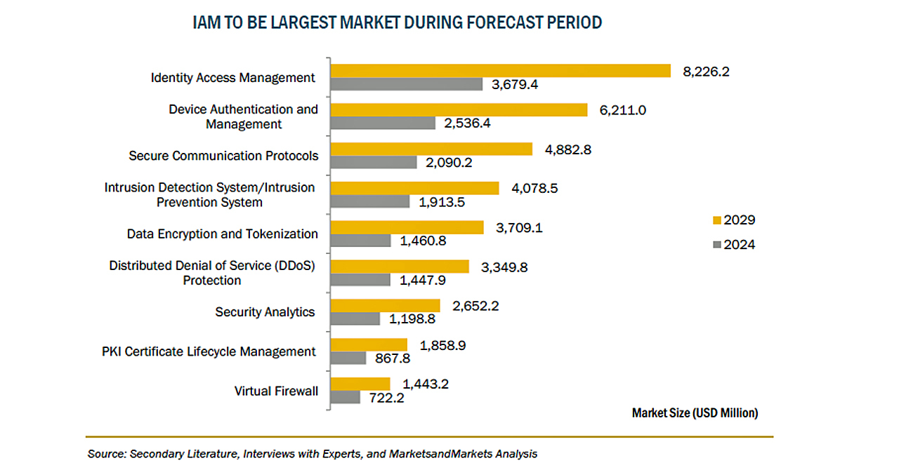 IoTセキュリティの市場規模は、2024年の242億米ドルからCAGR18.4%で成長し、2029年には562億米ドルに達すると予測されています。デジタル変革の時代において、あらゆる業種がIoTをビジネスに統合することで自動化を採用しています。この自動化により業務は大幅に効率化し、同時にシステムはサイバー攻撃に対して脆弱になります。このため、IoTセキュリティソリューションやサービスの採用により、より安全な重要インフラの需要が高まっています。