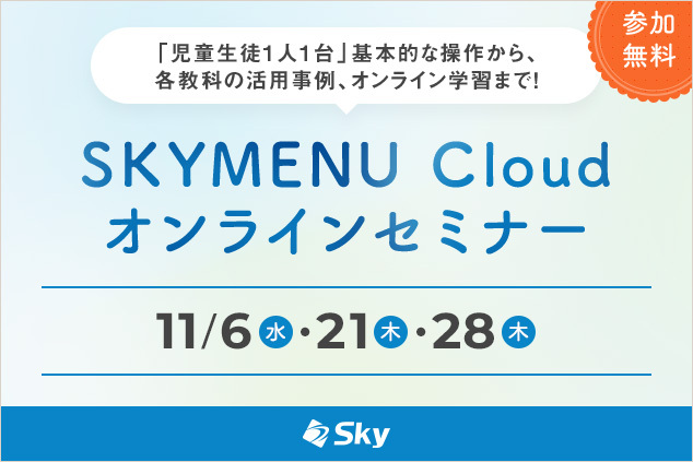 実際の授業を想定した活用シーンに合わせて「SKYMENU Cloud」の操作をご体験いただけるセミナーです。操作方法や活用場面などに関するご質問も承りますので、ぜひお気軽に「SKYMENU Cloud」をご体験ください。