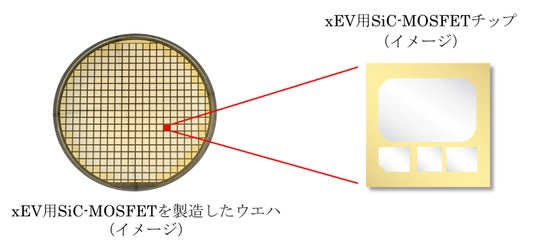xEV用SiC-MOSFETを製造したウエハ(左)とサンプル提供を開始するチップ(右)(イメージ)