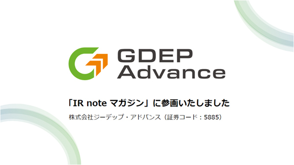 ジーデップ・アドバンスは、これまでPR情報や適時開示・各プレスリリースの配信などを通して当社の情報発信を行いつつ、投資家の皆さまとは決算説明会や1on1のミーティングを通してコミュニケーションの場を設けさせていただいておりました。この度の「IR note マガジン」への参画を機に、他企業の皆さまのお力をお借りしつつ、より多くの方にジーデップ・アドバンスへの理解を深めていただけるような情報発信を行い、企業価値の向上に努めて参ります。