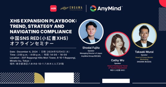 ENGAWA株式会社(読み:エンガワ、代表取締役社長:牛山 隆信、以下「当社」)とAnyMind Group株式会社(読み:エニーマインドグループ、代表取締役CEO:十河 宏輔)は、中国市場における観光やライフスタイルのトレンドを活用し、中国市場進出を目指す日本企業向けに「中国市場最新トレンドと活用事例を知る」無料オフラインセミナーを2024年12月4日(水)14:00より当社東京オフィスにて開催します。
