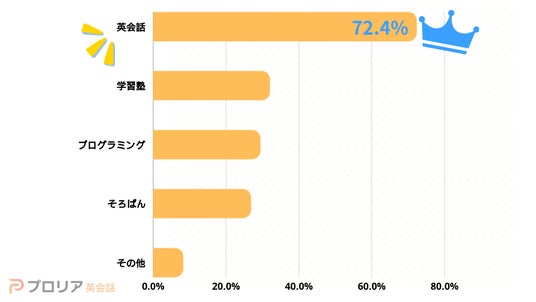 学習系の習い事に「通わせたい」または「通わせたかった」と回答した156名のうち、お子さまに通わせたい学習系の習い事として「英会話」を挙げた人の割合はなんと72.4%でした。他の選択肢を圧倒しての結果となりました。
