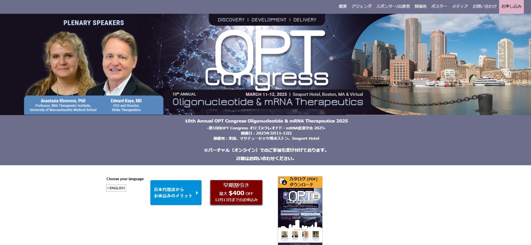 10th Annual OPT Congress Oligonucleotide & mRNA Therapeutics 2025にご参加希望の方は、お早めにお申し込みください。