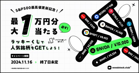 Z世代向けSNS型投資アプリwoodstock.club を運営する、「Woodstock(ウッドストック)」(東京都港区、代表取締役 ブライアン ジェフン ユン (リンク ») )にラッキーくじが登場!S&P500の過去最高を更新するなど、米国株市場が盛り上がっていますが、Woodstockでは、口座開設時にくじを引くことで、人気の銘柄の最大10,000円分の購入代金がもらえます。開設者にはもれなくプレゼントさせていただきますので、実質無償であなたも投資家デビューが可能。初めての投資体験をWoodstockが応援します。また、口座開設に新方式を採用し、日本在留の外国人の皆様にも口座開設をしていただけるようにもなりました。幅広い世代、国籍の皆様に、気軽に楽しく使っていただけるアプリを目指して、これからもサービスの拡充を図って参ります。